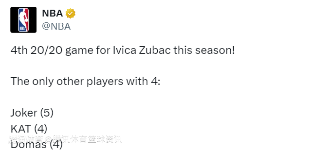 队史40年来第二人!祖巴茨轰24分20板5助 4场20+20仅次于约基奇
