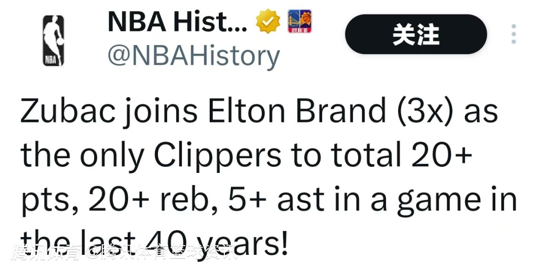 根据数据统计显示,祖巴茨凭借本场表现,和快船名宿布兰德(3次)成为过去40年里仅有的两位在单场比赛中得到20+分、20+篮板和5+助攻的快船队球员。