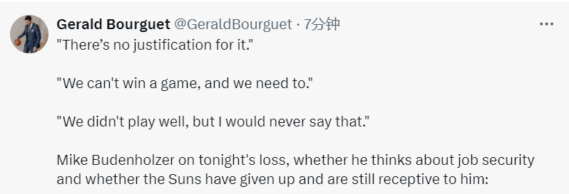 布登霍尔泽谈到本场失利,还谈到了他是否考虑过自己帅位的稳定性,以及太阳队是否已经放弃了比赛,还有球队是否依然接受他的执教:“对此没有任何合理的解释。我们赢不了比赛,但我们需要赢,而勇士队做到了这一切。我们打得不好,但我永远不会那么说。”