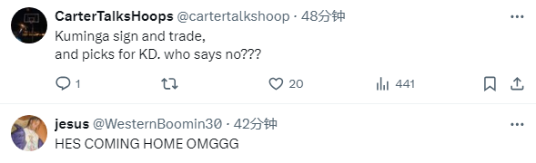 对于杜兰特和库里拥抱的画面,美球迷直言:我的天呐,他(杜兰特)真的要重返勇士了;还有球迷表示:用库明加先签后换和多个选秀权换杜兰特。