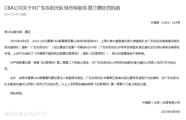 2025-04-09 21:40北京时间4月9日,根据CBA官方的公示,广东客场挑战上海的G2比赛首节进行到第一节剩余6分47秒,广东东阳光队26号球员埃里克·莫兰德对主队球队席做出侮辱性手势。