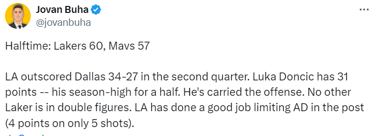 除了东契奇之外,湖人队没有其他球员得分上双,但他们依然半场领先了独行侠队3分。浓眉上半场出战16分钟,5投2中得到4分4篮板4助攻1盖帽。