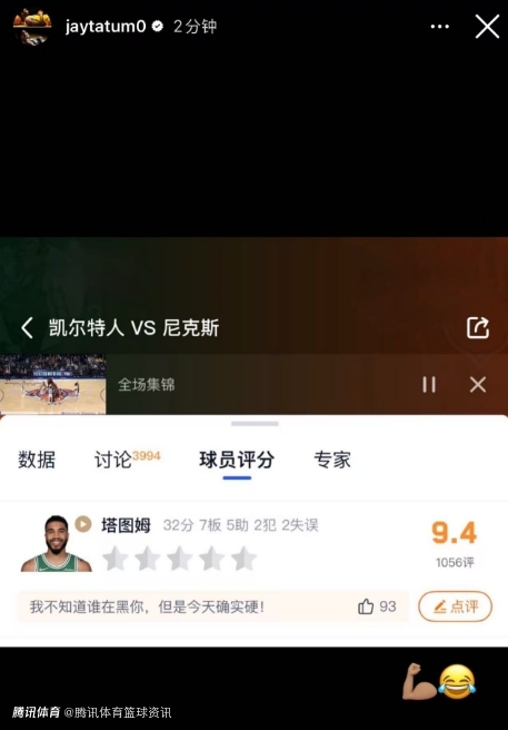 塔图姆社媒转发腾讯体育评分截图 打尼克斯获9.4分被赞太硬了
