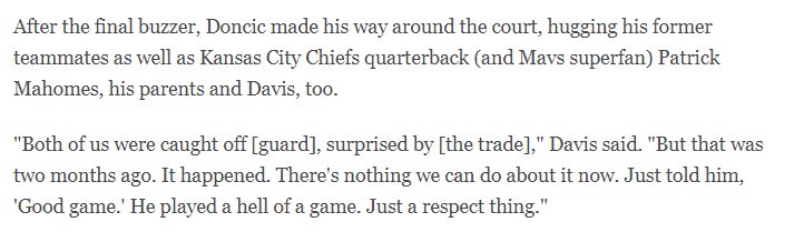 在谈到自己与东契奇说了些什么的时候,戴维斯表示:“我们俩当时都(对这笔交易)毫无准备,感到很意外,但那都是两个月前的事了。事情已经发生了,现在我们也无能为力。我就跟他说,‘打得不错。’他这场比赛打得非常出色,这只是出于一种尊重。”