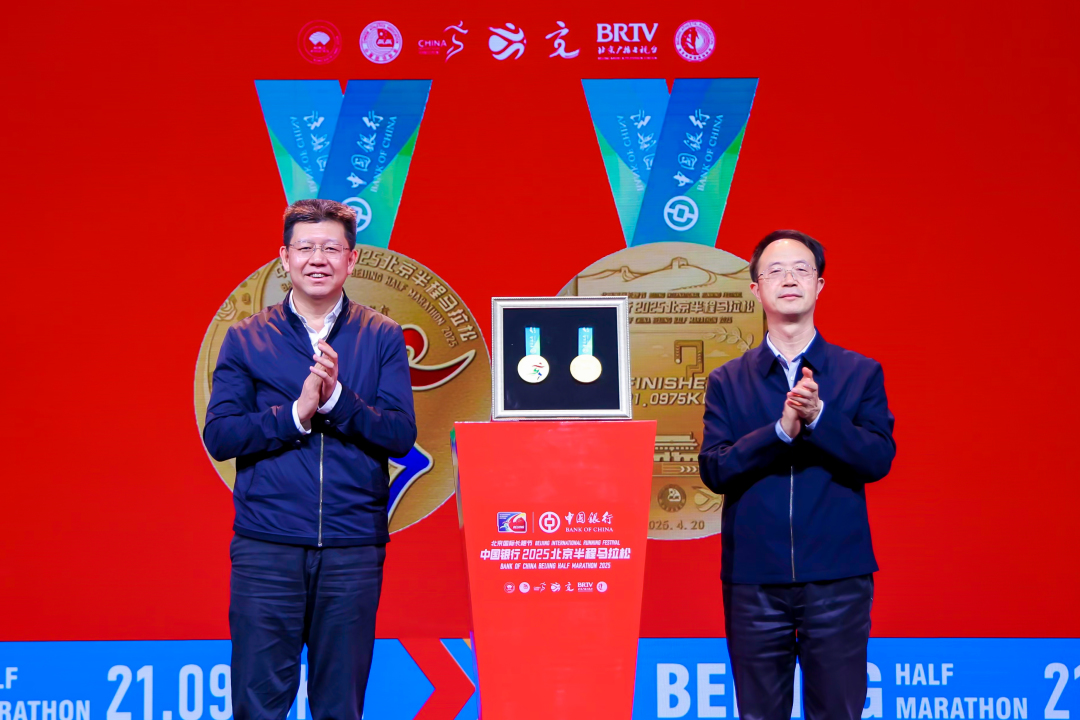 北京市委宣传部副部长、北京广播电视台党组书记、台长余俊生和北京市体育局党组书记、局长于庆丰现场揭晓了中国银行2025北京国际长跑节-北京半程马拉松完赛奖牌。这枚奔跑的勋章承载着古都的历史底蕴与新时代的体育精神。