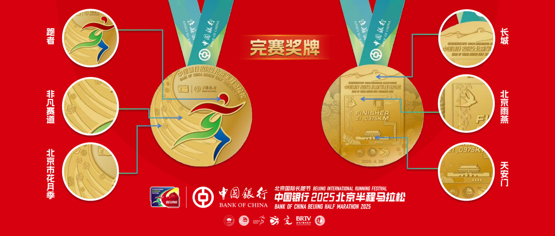 2025年北京半程马拉松完赛奖牌由中国印钞造币集团有限公司(上海造币有限公司的控股公司)设计并生产,以匠心设计诠释了赛事主题“一城春色半程诗”。奖牌正面展示的是长跑节logo中的跑者,同时还采用流动的线条勾勒出了跑道的轨迹,轨道上点缀着北京的市花月季,错落有致地分布,形成一条繁花似锦的奔跑之路。奖牌背面中心区域雕刻着天安门到鸟巢的“非凡赛道”,上方是雄伟的长城,同时四周环绕着绽放的繁花与舒展的新枝,交织出一幅春意盎然的画卷。而振翅高飞的北京雨燕,是速度和耐力的象征,也寓意着城市与自然和谐共生的马拉松理念。