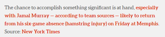 在穆雷缺席的这6场比赛中,掘金曾一度遭遇4连败,主帅马龙和总经理布斯双双下课,球队在大卫-阿德尔曼接管后,刚刚在对阵国王的比赛中取得一场胜利,结束连败。
