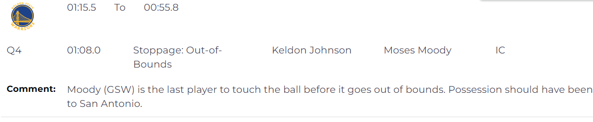 第一次是错判,距离比赛结束还有1分8秒,双方107-107打平,摩西-穆迪是最后触球的球员,球出界前由他触碰,因此球权本应判给马刺。这是错判,勇士获利。