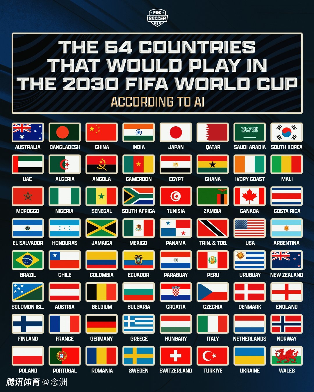 不过也许令人欣慰的是,根据AI预测,国足会出现在2030年世界杯决赛圈的舞台上。