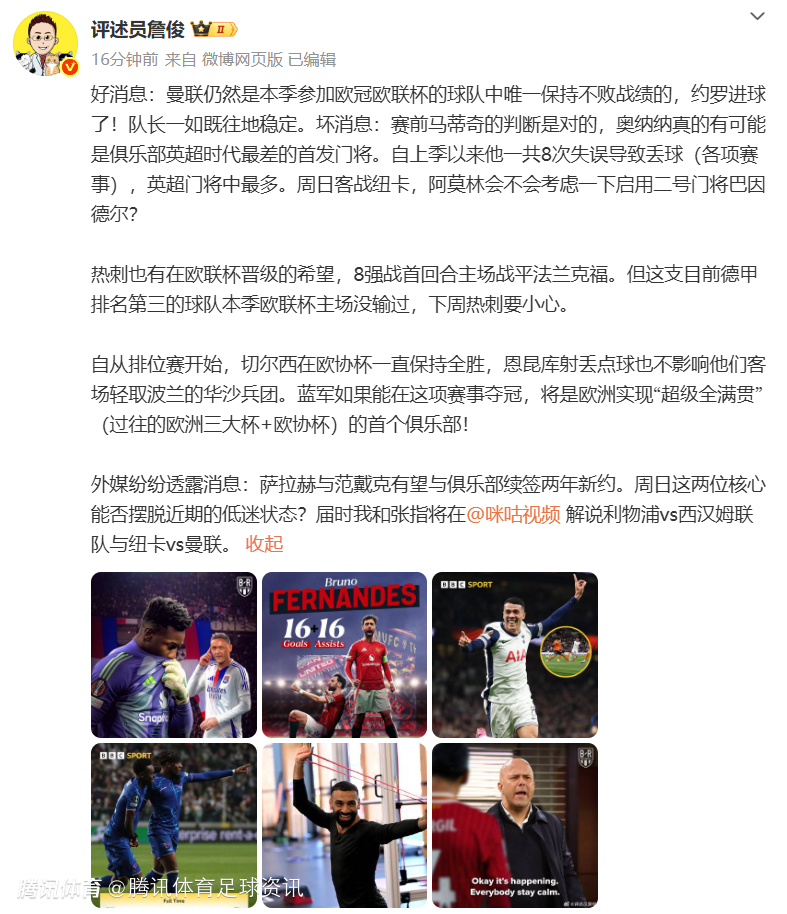 2025-04-11 08:50北京时间4月11日凌晨,欧联杯1/4决赛首回合,曼联客场2-2战平里昂。本场赛后评论员詹俊也是在社媒发文表达了自己的看法。