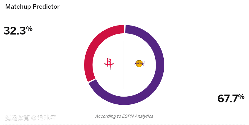明日湖人将在主场迎战火箭,对于本场比赛,ESPN预测湖人赢球概率为67.7%,火箭赢球概率为32.3%,换言之,ESPN看好湖人赢球。