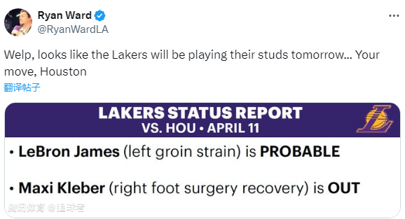 2025-04-11 09:50北京时间4月11日,NBA常规赛接近收官,明日湖人将在主场大战火箭,湖人官方宣布詹姆斯(左腹股沟拉伤)大概率出战,克莱伯(右脚手术恢复)继续缺战,东契奇、里夫斯等其他球员都不在伤病名单上,湖人记者Ryan Ward表示看起来湖人将会全力出击。