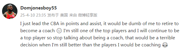 2025-04-11 10:10CBA外援多米尼克-琼斯10日深夜在社媒上表示,他仍是联赛的顶级球员,现在如果就退役执教那就太蠢了。