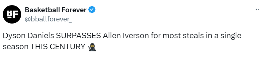 根据数据统计显示,凭借本场比赛表现,戴森-丹尼尔斯本赛季已累计送出226次抢断,超越了2002-03赛季艾弗森的225次抢断,在本世纪单赛季抢断数排行榜上独占鳌头,成为了近20多年来单赛季抢断最多的球员。