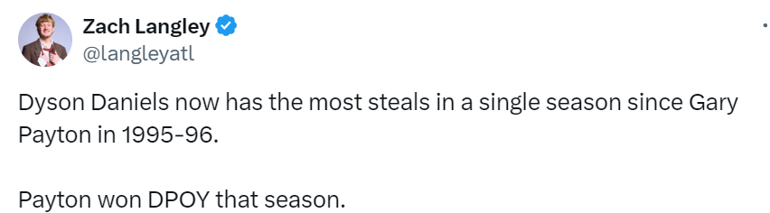 另有数据显示,戴森-丹尼尔斯现在的单赛季抢断数是自1995-96赛季加里-佩顿达成的231次抢断之后最多的一次,而佩顿在那个赛季赢得了年度最佳防守球员奖项。本赛季,戴森-丹尼尔斯同样有望竞争年度最佳防守球员,相比之下,他当选年度最快进步球员的希望更大。