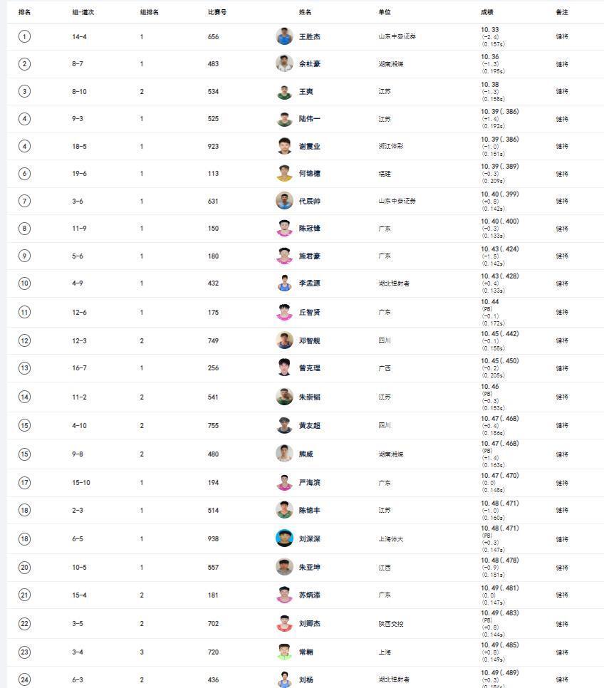 谢震业以总成绩第4名进入半决赛,苏炳添总成绩排名第21位,同样跻身半决赛。此外像陈冠锋、邓智舰、严海滨等名将,也顺利进入到半决赛比赛。陈佳鹏10秒52排名第28位,爆冷止步预赛。