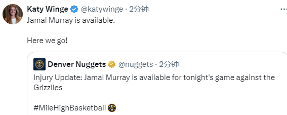 2025-04-12 08:30北京时间4月12日,NBA常规赛继续进行,掘金队对阵灰熊队。赛前,掘金队官方宣布,贾马尔-穆雷此役可以出战。