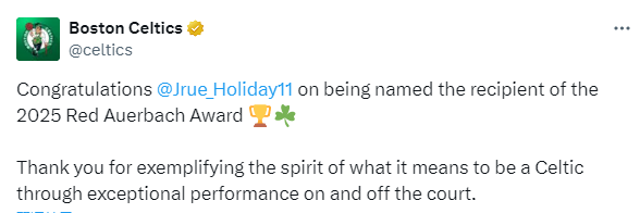 格鲁斯贝克在一份声明中表示:“霍乐迪是我们球队取得成功的关键人物。无论是在比赛中还是作为领导者,他对卓越的追求为身边的每个人树立了榜样。他总是以正确的方式做正确的事。他完美地诠释了作为一名凯尔特人队球员的意义,那就是专注、无私,并且在追求成功的道路上坚持不懈。” 本场比赛前,霍乐迪本赛季为凯尔特人队出战了61场比赛,场均得到11.2分4.3篮板3.9助攻1.0抢断。霍乐迪曾入选2023-24赛季NBA最佳防守阵容,并且在2024年巴黎奥运会上赢得金牌。