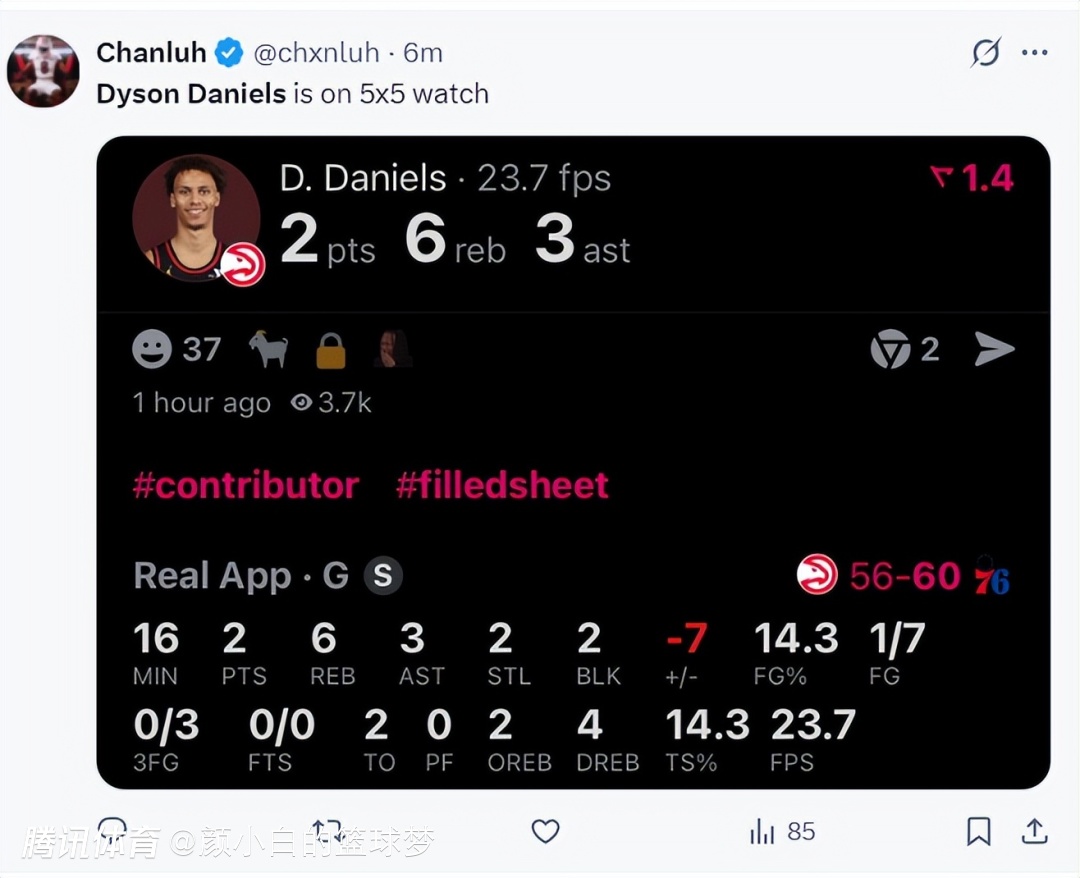 下半场丹尼尔斯终于找回了一点手感,4中3拿到6分4篮板4助攻1抢断,全场比赛丹尼尔斯11中4+三分4中0+罚球2中0拿到8分10篮板8助攻3抢断2盖帽0犯规,命中率36.4%,此役戴森效率不高,可他又贡献了三次抢断,已经完成229次三双,距离佩顿的231次只差2个,他如果最后一场出战,超过佩顿应该不成问题。