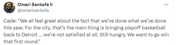 坎宁安说道:“我们今年所取得的成就,让我们每个人都感觉很棒。对于这座城市而言,最重要的是我们把季后赛级别的篮球赛事重新带回了底特律。但我们一点都不满足,我们依旧充满渴望,我们想要在首轮比赛中获胜。”