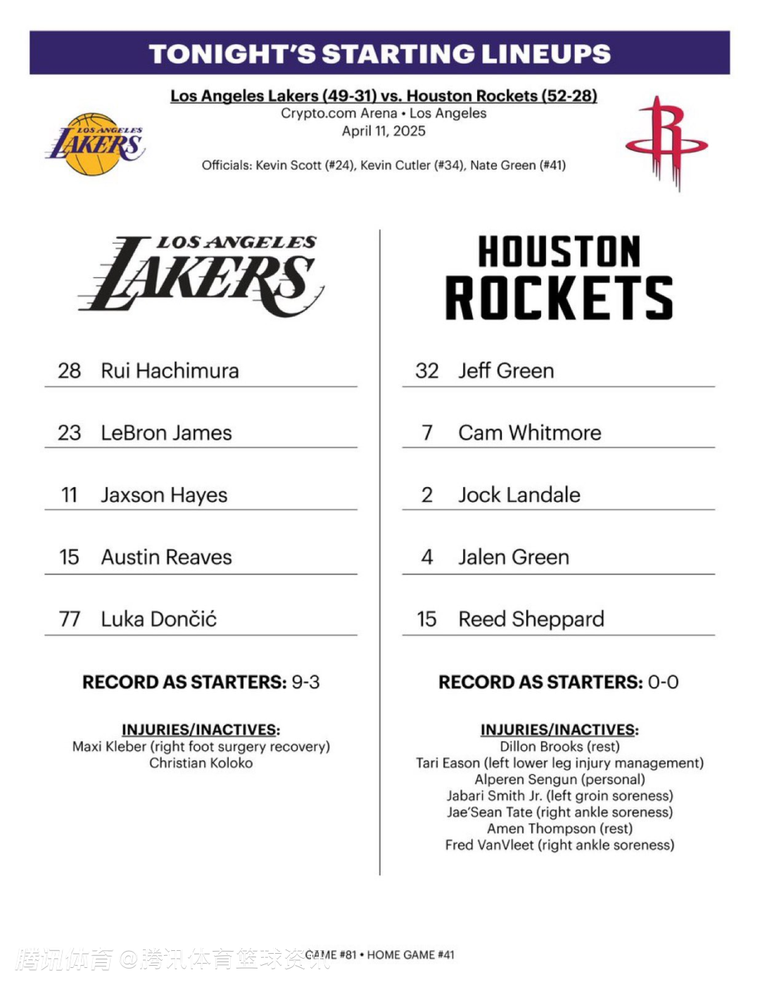 2025-04-12 10:20北京时间4月12日,NBA常规赛继续进行,湖人队对阵火箭队。赛前,双方公布了本场比赛的首发名单,湖人队詹姆斯和东契奇领衔出战,而火箭队7人缺阵,常规首发仅剩下杰伦-格林1人。具体情况如下: