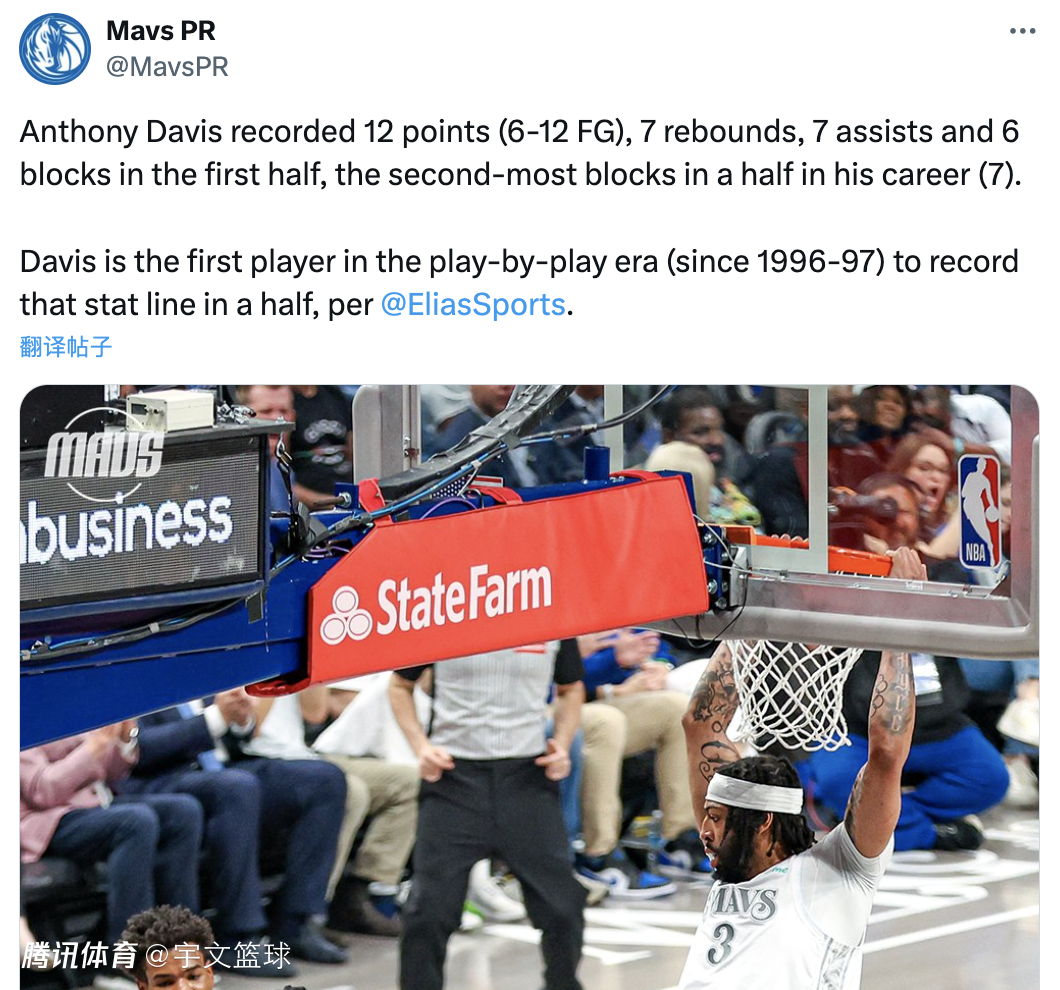 首先,上半场比赛浓眉爆砍12分7篮板7助攻6盖帽,成为实况转播时代以来首位贡献此数据球员;