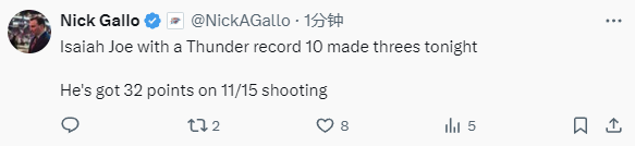 根据数据统计显示,乔此役在三分线外总计14投10中,单场命中10个三分球,不仅创造了乔的生涯新高,也追平了雷霆队史单场三分球命中纪录。保罗-乔治在2019年效力雷霆队时也曾单场命中过10个三分球。