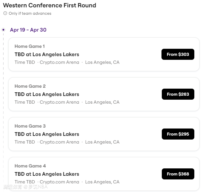 从经济角度出发,多一个主场,也意味着多赚钱。至于多赚多少钱?看看目前已经出炉的湖人季后赛首轮主场最低票价吧。
