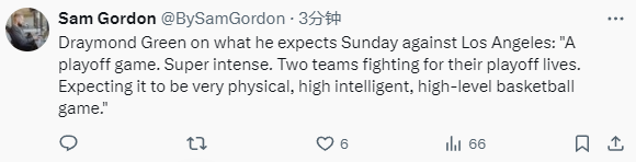 格林表示:“这会是一场季后赛级别的比赛。对抗超级激烈。两支球队都在为了自己的季后赛命运而拼搏。预计这场比赛的身体对抗会非常激烈,同时也是一场充满高球商、高水平的篮球比赛。”