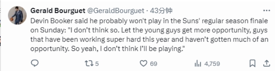 布克说道:“我觉得我不会出战。让年轻球员获得更多机会吧,那些今年一直非常努力但没得到太多机会的球员。所以,是的,我想我不会上场比赛。”