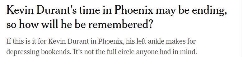 如果这真的是杜兰特在菲尼克斯的谢幕演出,那他的左脚踝伤病就成了令人沮丧的首尾呼应。2023年交易截止日,杜兰特从篮网队被交易至太阳队,在回到亚利桑那州之前,他先出战了三场客场比赛。在他的首个主场比赛前,杜兰特在赛前热身时扭伤了左脚踝,这次意外让他休战三周。两年多后,在对阵火箭队的比赛中,几乎同一位置,他遭遇了同样的伤病。