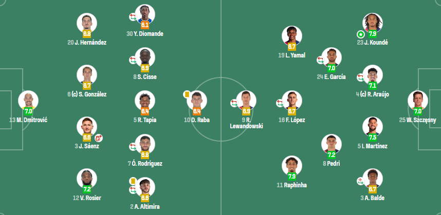 巴塞罗那(4-2-3-1):什琴斯尼;孔德,阿劳霍(46'德容),伊尼戈-马丁内斯,巴尔德(41'赫拉德-马丁);埃里克-加西亚(80'库巴西),佩德里;亚马尔,费尔明-洛佩斯(67'加维),拉菲尼亚;莱万多夫斯基(67'费兰-托雷斯)