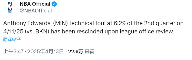 2025-04-13 05:40北京时间4月13日,NBA官方宣布,取消对明尼苏达森林狼队后卫安东尼-爱德华兹在周六比赛第二节所领到的技术犯规。对于森林狼来说,这无疑是一大利好。
