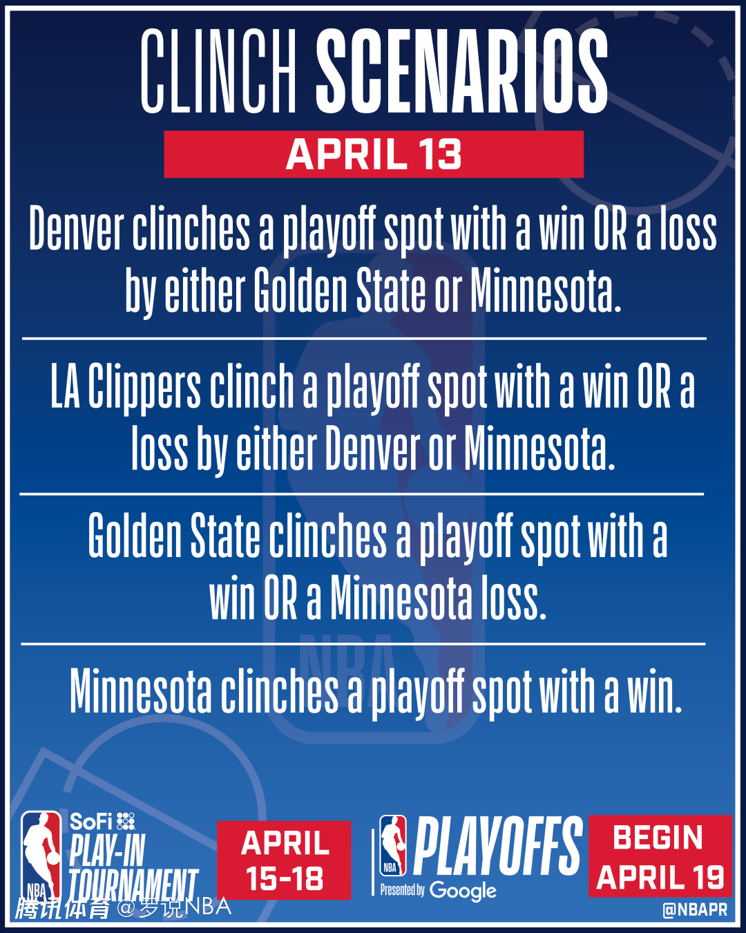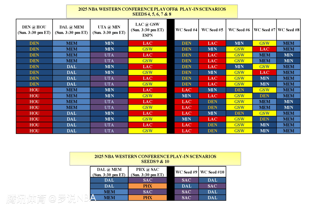 NBA官方在社媒上发布了一张实用的图表,解释了所有可能的16种结果。简而言之,掘金、快船、勇士和森林狼正在争夺最后三个直通季后赛的席位,每支球队都需要一场胜利来锁定西部前六的位置。