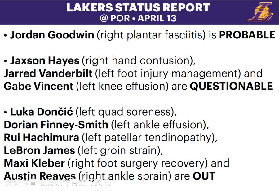 2025-04-13 08:20北京时间4月13日,NBA常规赛还剩最后一轮比赛,湖人将对阵开拓者。赛前,湖人方面公布球队本场伤情,东契奇、詹姆斯、里夫斯确定缺阵,已有6人确定不会上场。