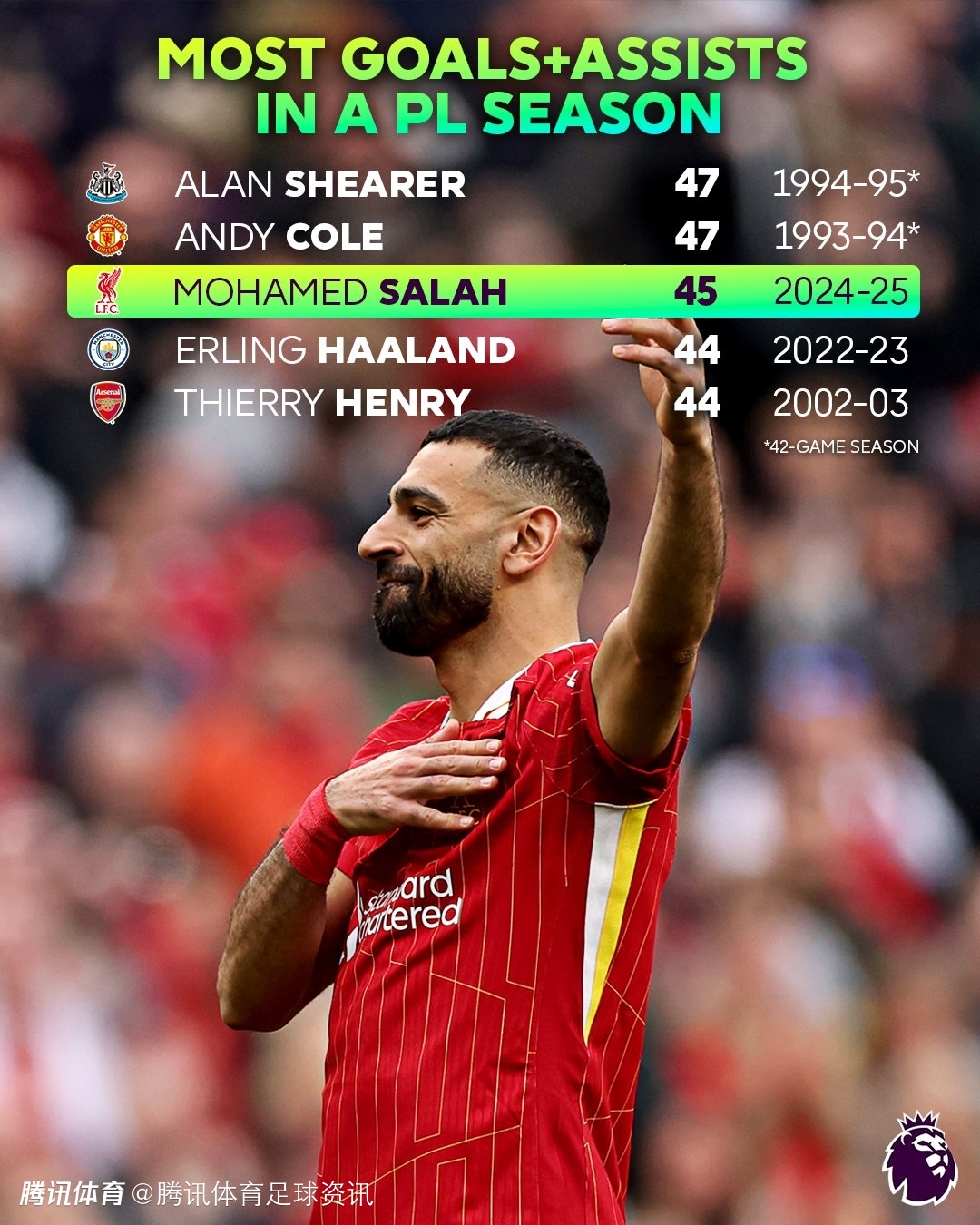 27球+18助!萨拉赫直接参与45球打破英超38轮制单赛季最多参与进球纪录