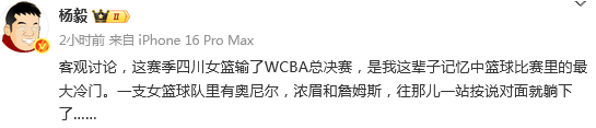 媒体人杨毅发文点评说道:“客观讨论,这赛季四川女篮输了WCBA总决赛,是我这辈子记忆中篮球比赛里的最大冷门。