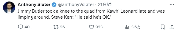 在谈到巴特勒在比赛后期与莱昂纳德相撞后一瘸一拐的情况时,科尔表示:“巴特勒说自己没事。”