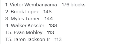 文班亚马本赛季场均送出3.8次盖帽,这是自1998-99赛季莫宁以来的最高场均盖帽数。他总计送出176次盖帽,而排在第二位的大洛佩兹总计送出148次盖帽,之后是特纳的144次盖帽,凯斯勒的138次盖帽,莫布利和小贾伦-杰克逊的113次盖帽。