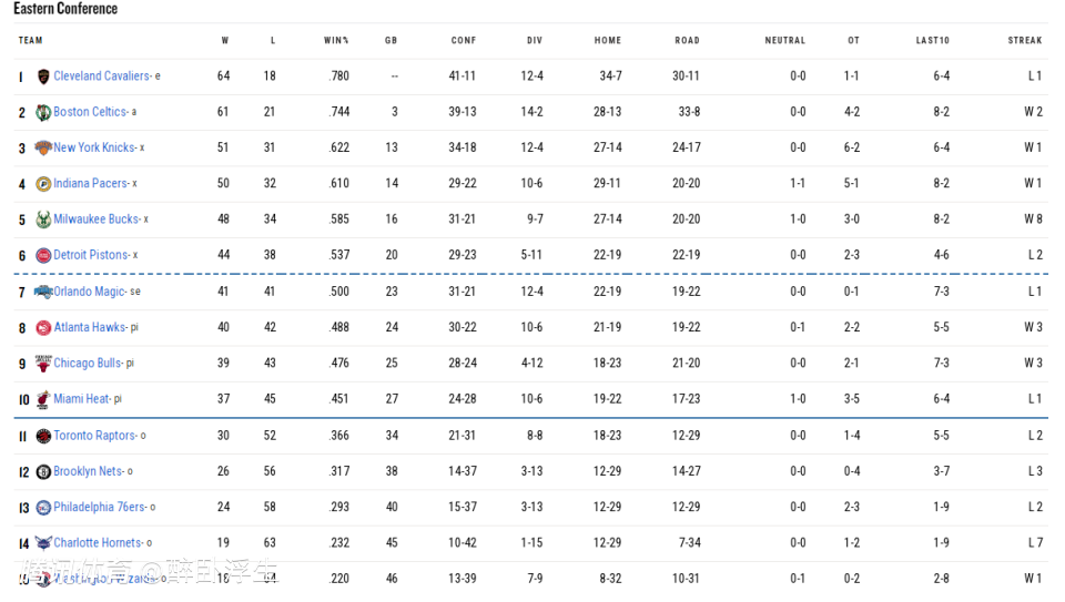 骑士本赛季64胜18负东部第一,创造队史单赛季第2好成绩,仅次于队史最佳的66胜16负。凯尔特人61胜21负东部第二,连续两个赛季达到至少60胜,创造队史16年纪录。尼克斯与步行者也达到至少50胜,76人24胜58负东部倒数第三,也是本赛季最令人失望的球队之一。
