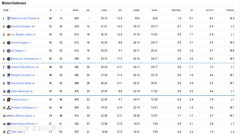 NBA常规赛排名:雷霆68胜常规赛冠军 3队60+胜火箭湖人50+胜进步