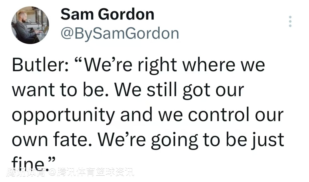 关于球队表现,巴特勒说道:“我们正处于我们想要达到的位置。我们仍然有机会,而且我们掌控着自己的命运。我们会一切顺利的。”