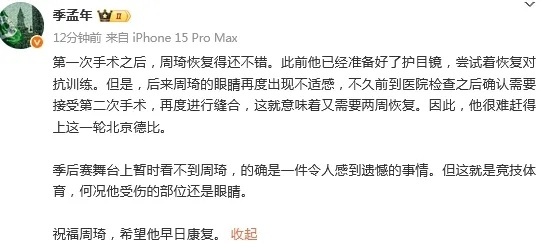 篮球记者孟季年提到第一次手术之后,周琦恢复得还不错。此前他已经准备好了护目镜,尝试着恢复对抗训练。但是,后来周琦的眼睛再度出现不适感,不久前到医院检查之后确认需要接受第二次手术,再度进行缝合,这就意味着又需要两周恢复。因此,他很难赶得上这一轮北京德比。