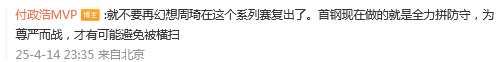 对于周琦能否回归的话题,付政浩评论说道:就不要再幻想周琦在这个系列赛复出了。首钢现在做的就是全力拼防守,为尊严而战,才有可能避免被横扫。