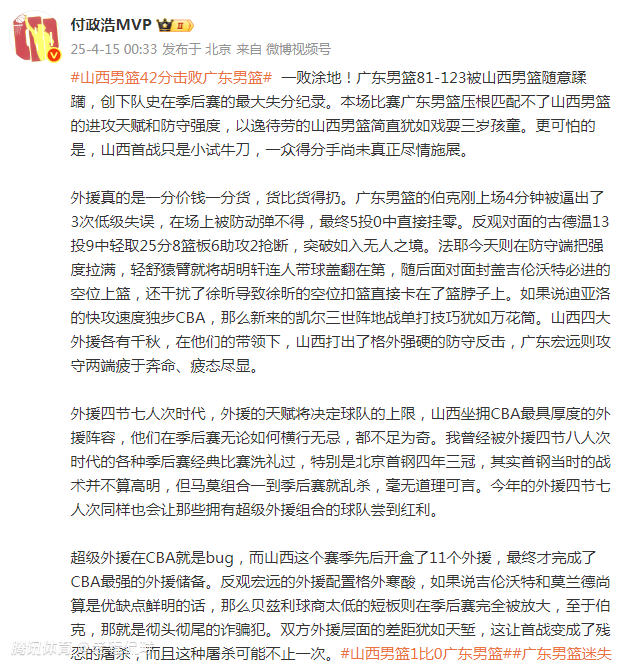 2025-04-15 01:20媒体人付政浩发文评价山西男篮八强赛首战大胜广东队时表示双方外援实力差距巨大。广东队外援贝兹利球商太低,伯克是彻头彻尾的诈骗犯。