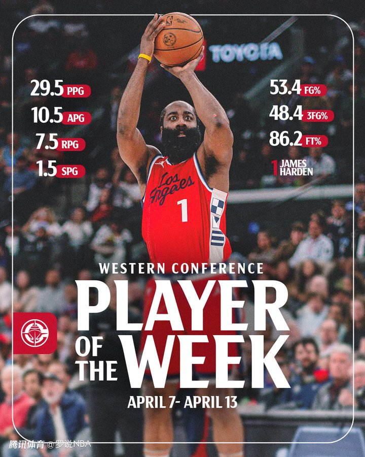 哈登在加时赛的统治级表现,是快船最终拿下胜利的关键。NBA官方今日也刚刚宣布,哈登当选常规赛最后一周的西部周最佳球员,这是他生涯第27次当选,也是时隔4年的首次当选,上一次获得周最佳是在2021年2月。