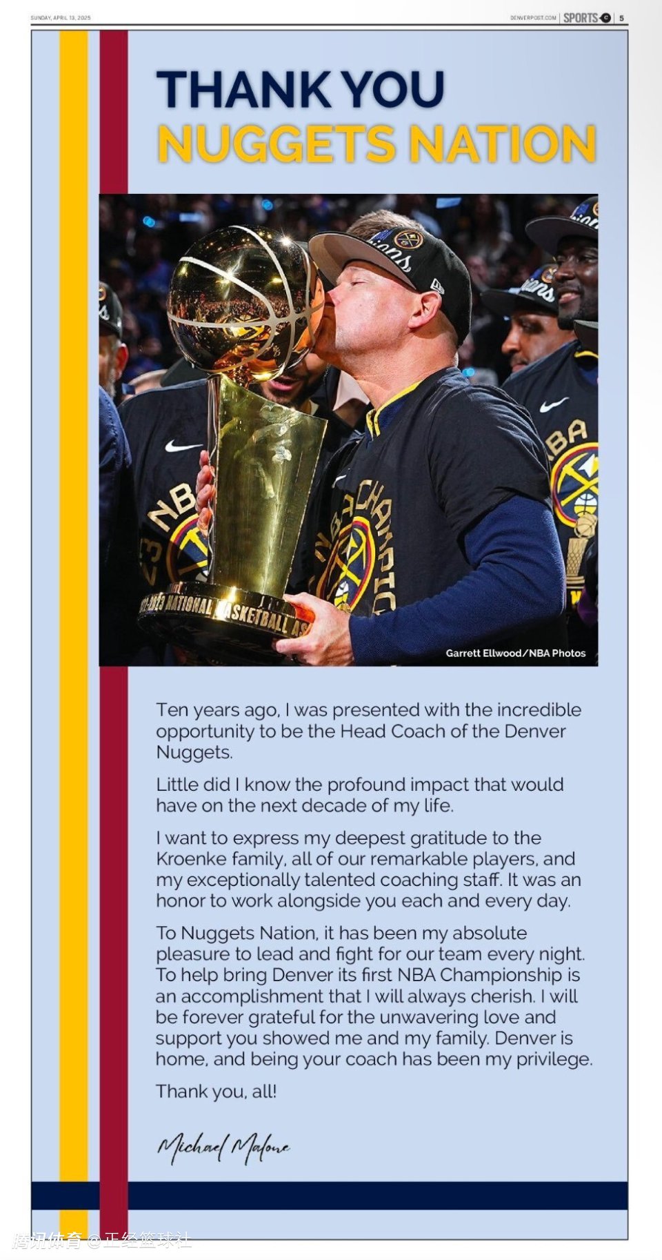 致掘金球迷们—— 能带领这支球队每晚为胜利而战,是我莫大的荣幸。帮助丹佛带回首座NBA总冠军奖杯,是我一生都会珍视的成就。我会永远感激你们给予我和我家人坚定不移的支持与爱。丹佛就是我家,成为你们的教练,是我无上的荣耀。