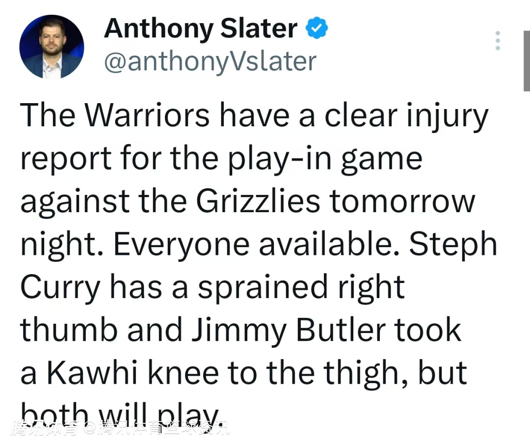 勇士更新附加赛伤情:库里巴特勒均无大碍 全员均可出战灰熊