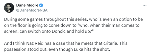 在谈到森林狼队对于湖人队挡拆进攻的防守时,Dane Moore结合了去年西部决赛的视频,并认为里德是最适合在挡拆中换防东契奇的内线球员。该记者写道:“如果你无法挡住东契奇的进攻,那么可能会遭遇惨败。当湖人队发起挡拆时,谁可以换防东契奇呢?我认为里德完全符合这个标准。”