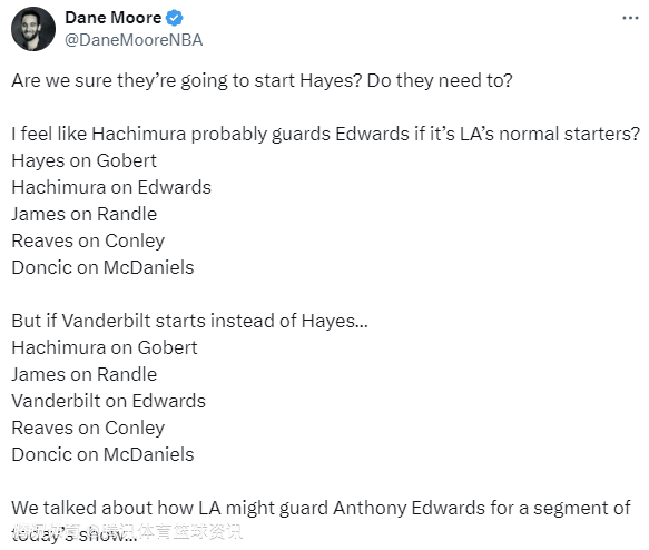 在谈到首发阵容的常规对位时,该记者表示:“如果湖人首发海耶斯,那么戈贝尔对位海耶斯,八村垒会防爱德华兹,詹姆斯防兰德尔,里夫斯对位康利,东契奇对位麦克丹尼尔斯。如果湖人用范德比尔特取代海耶斯打首发,那么八村垒会对位戈贝尔,范德比尔特防爱德华兹,詹姆斯、里夫斯和东契奇的对位不变。”